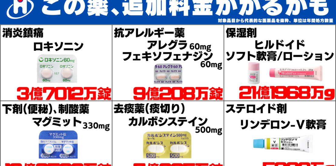 維新が全額自費を求めている薬剤 アレグラ錠/フェキソフェナジン9億208万錠、ヒルドイドソフト軟膏/ローション21億1968万g、ロキソニン3億7012万錠