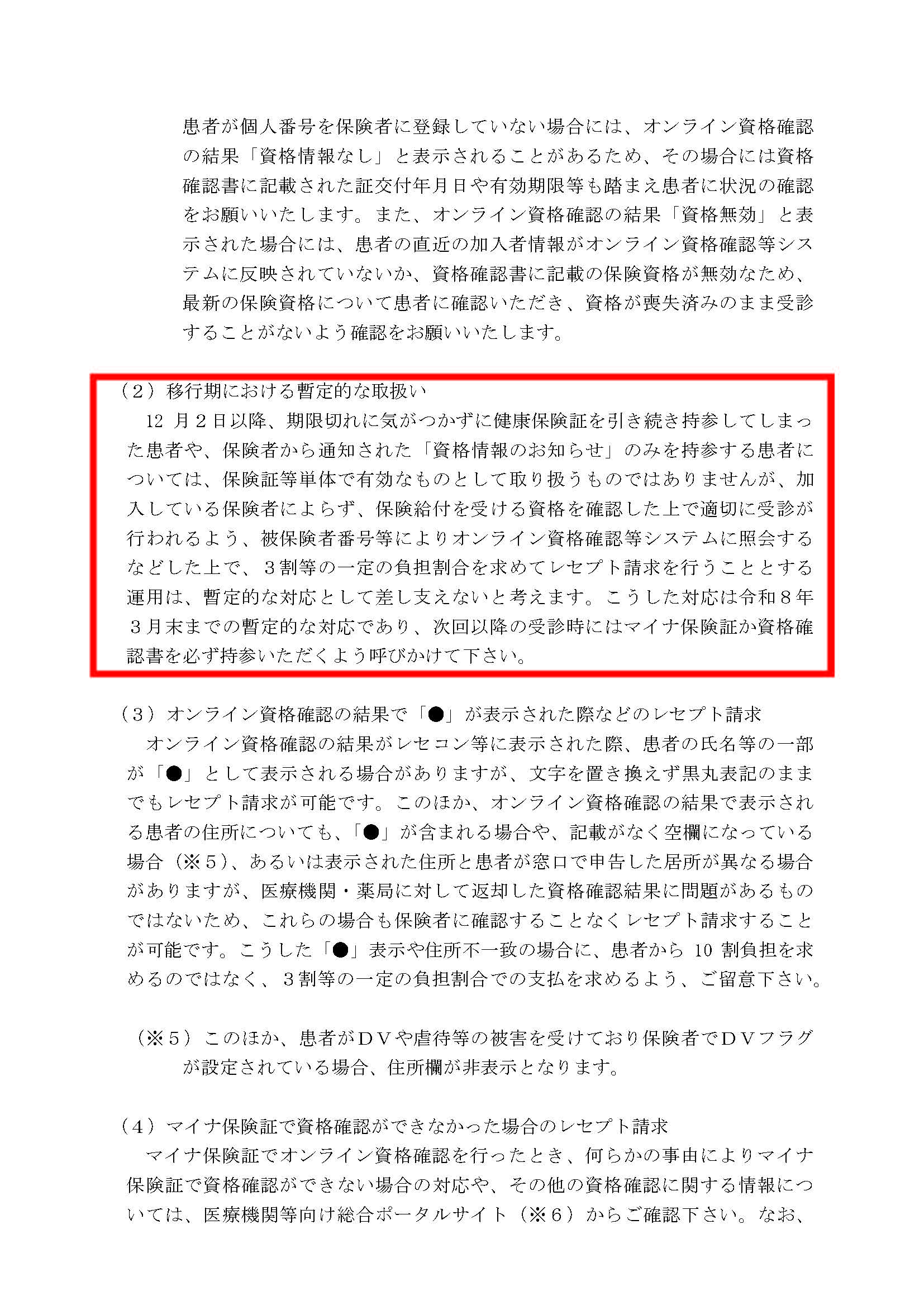 12 月2日以降、期限切れに気がつかずに健康保険証を引き続き持参してしまった患者や、保険者から通知された「資格情報のお知らせ」のみを持参する患者については、保険証等単体で有効なものとして取り扱うものではありませんが、加入している保険者によらず、保険給付を受ける資格を確認した上で適切に受診が行われるよう、被保険者番号等によりオンライン資格確認等システムに照会するなどした上で、3割等の一定の負担割合を求めてレセプト請求を行うこととする運用は、暫定的な対応として差し支えないと考えます。こうした対応は令和8年3月末までの暫定的な対応であり、次回以降の受診時にはマイナ保険証か資格確認書を必ず持参いただくよう呼びかけて下さい。