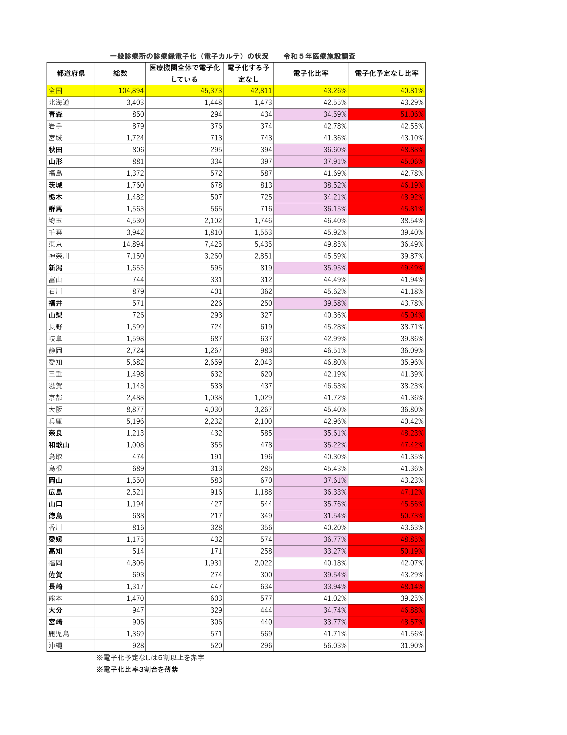 医療施設調査(2023年)の都道府県別のデータで見ると、電子化比率は全国平均で43.26%、電子化予定なし比率は全国平均で40.81%でした。また、電子化比率が3割代の都道府県は20都府県、電子化予定なし比率が四捨五入して5割を超える都道府県は18都府県でした(上図参照)。東北、北陸、四国、九州などの人口減少で外来患者数の減少が進展する地域で、電子カルテ導入比率が比較的少ない傾向にあります。