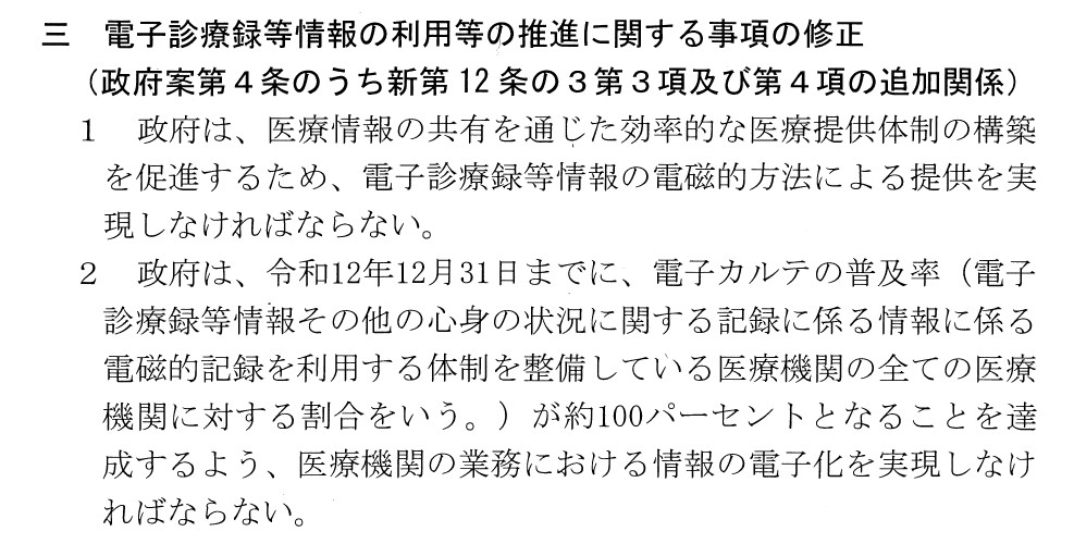 自民党と日本維新の会が臨時国会に提出する医療法修正案(要綱)には、「 政府に対して令和12年12月31 日までに、電子カルテの普及率(電子診療録等情報その他の心身の状況に関する記録に係る情報に係る電磁的記録を利用する体制を整備している医療機関の全ての医療機関に対する割合をいう。)が約100パーセントとなることを達成するよう、医療機関の業務における情報の電子化を実現しなければならない。」と明記されています。