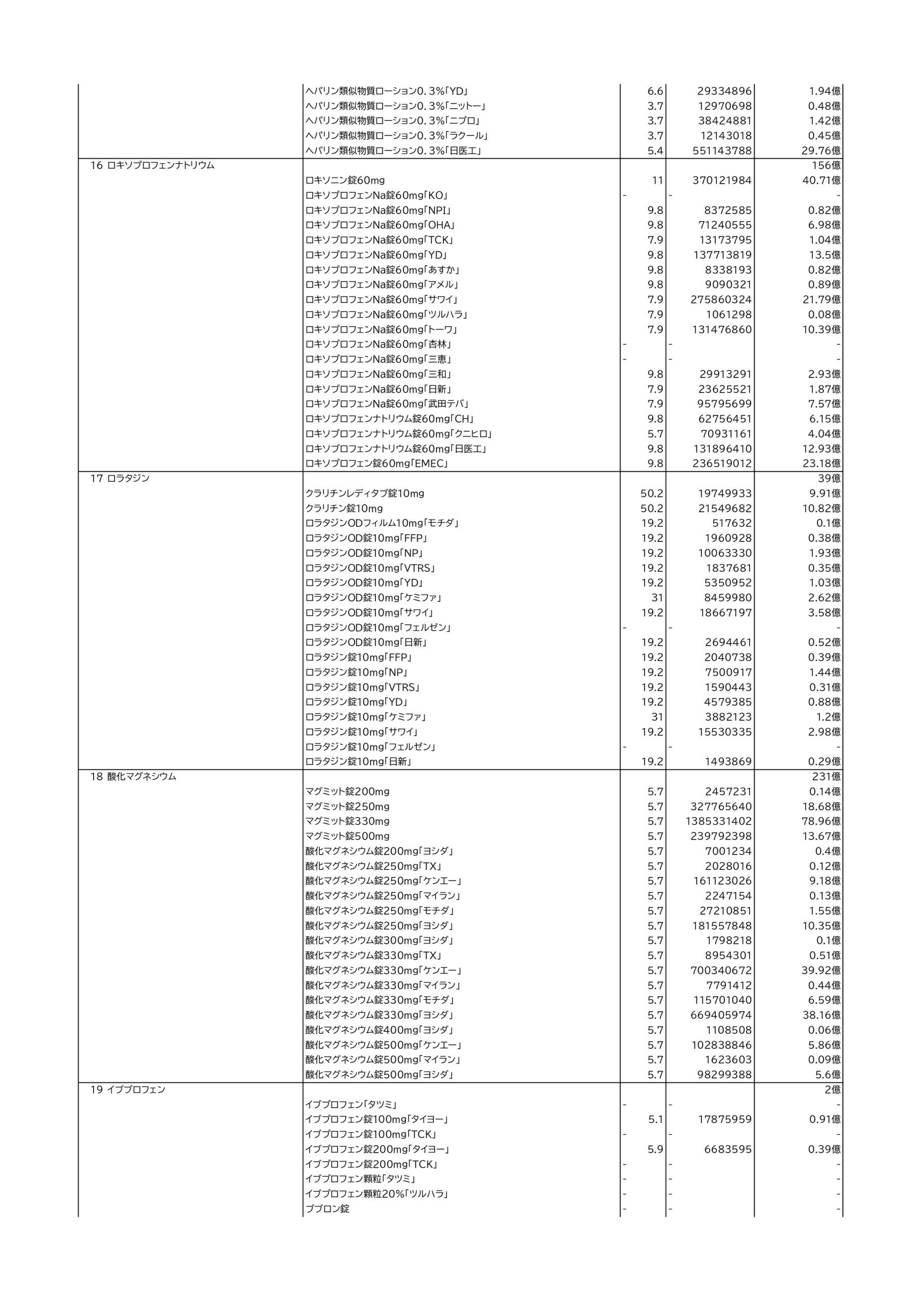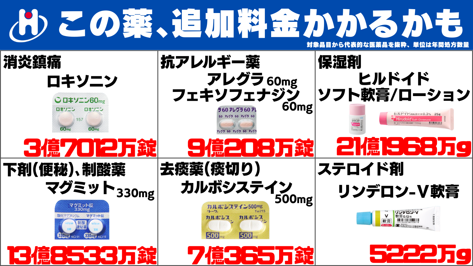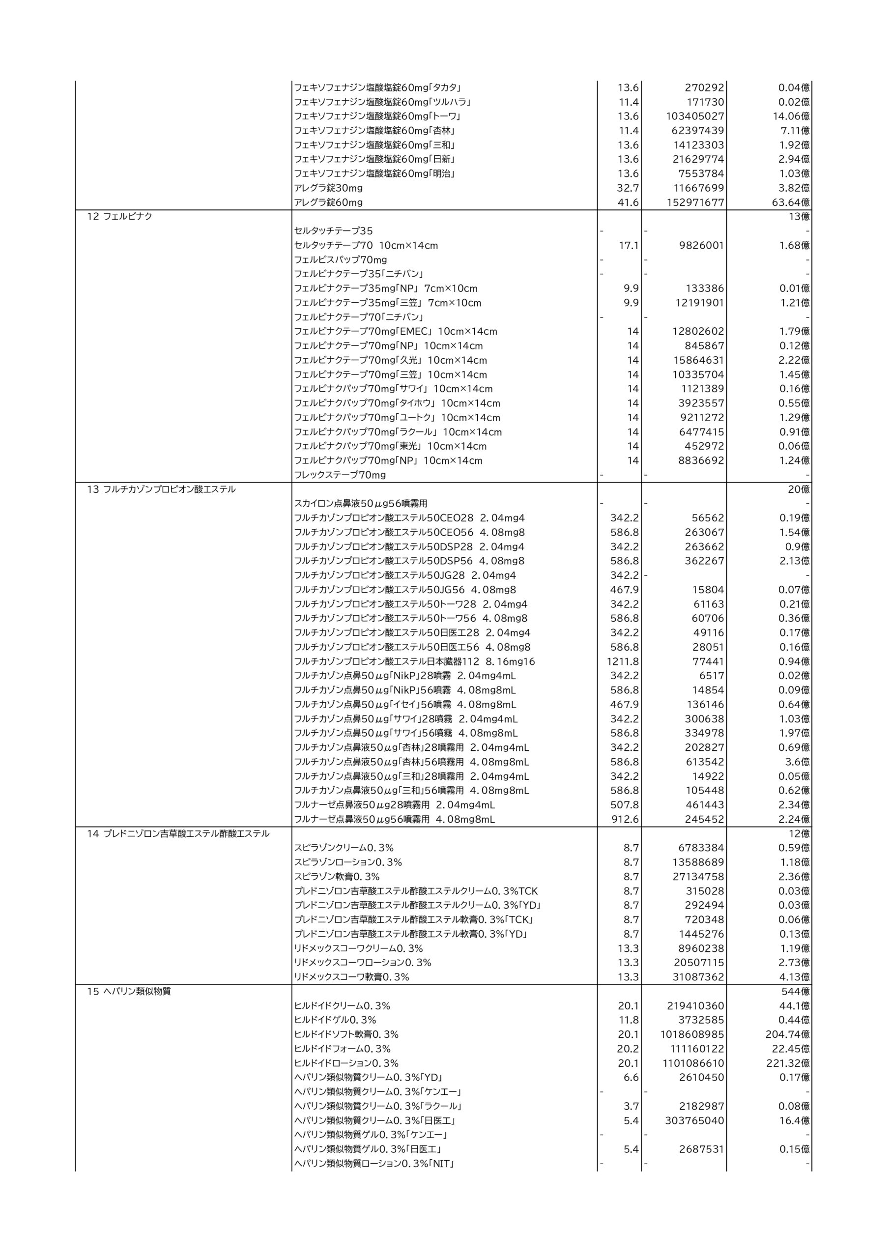 アレルギー疾患や喘息などで用いる抗アレルギー薬のアレグラ錠60mg/フェキソフェナジン60gは9億208万錠、抗ヒスタミン薬のベポタスチンベシル酸塩錠10mg「タナベ」で年間2億6566万7350錠なども億単位で使用されています。