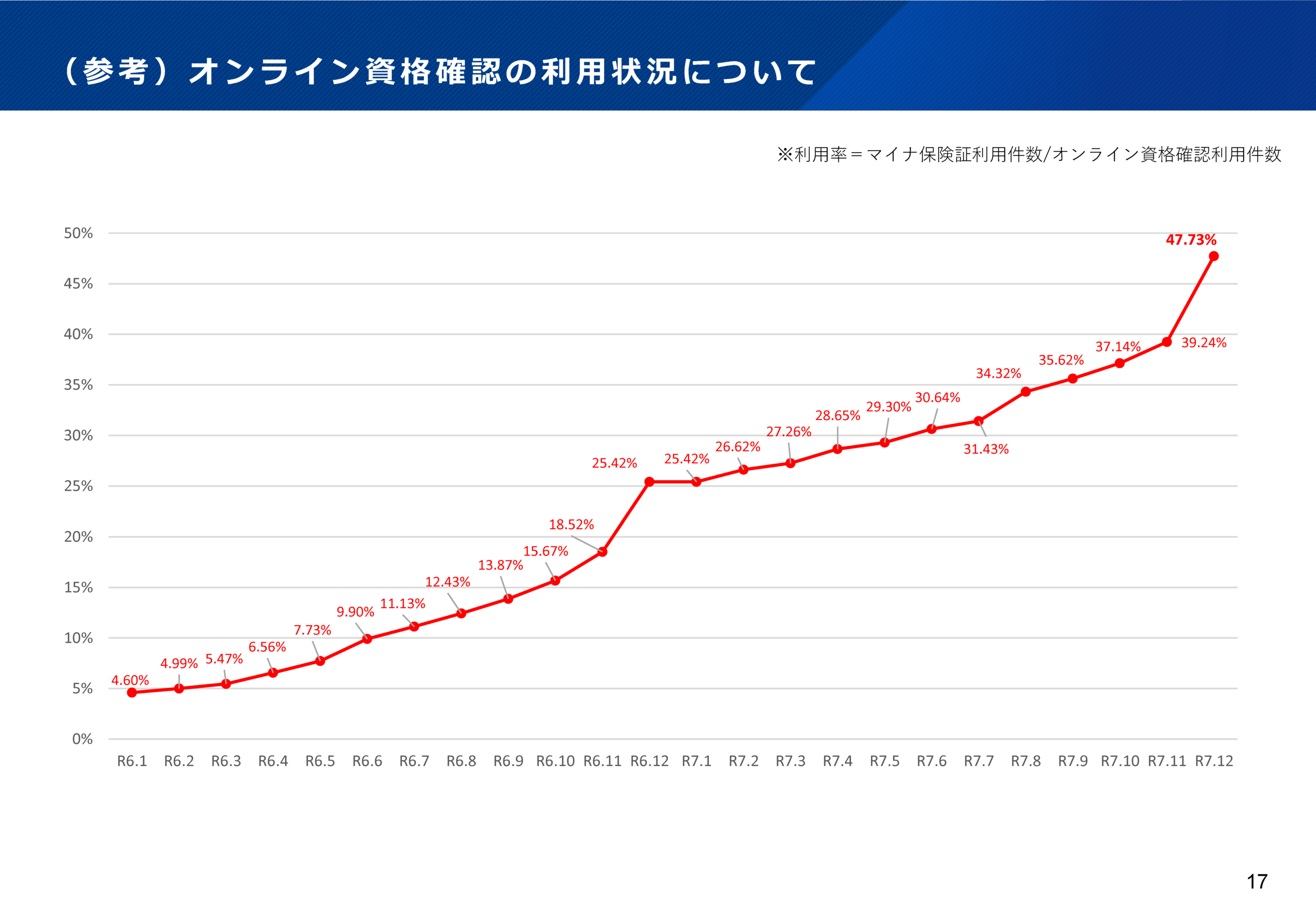厚労省は1月20日、2025年12月のマイナ保険証利用率(オンライン資格確認の利用件数に占めるマイナ保険証の利用件数の割合)が47.73%だったと公表しました。