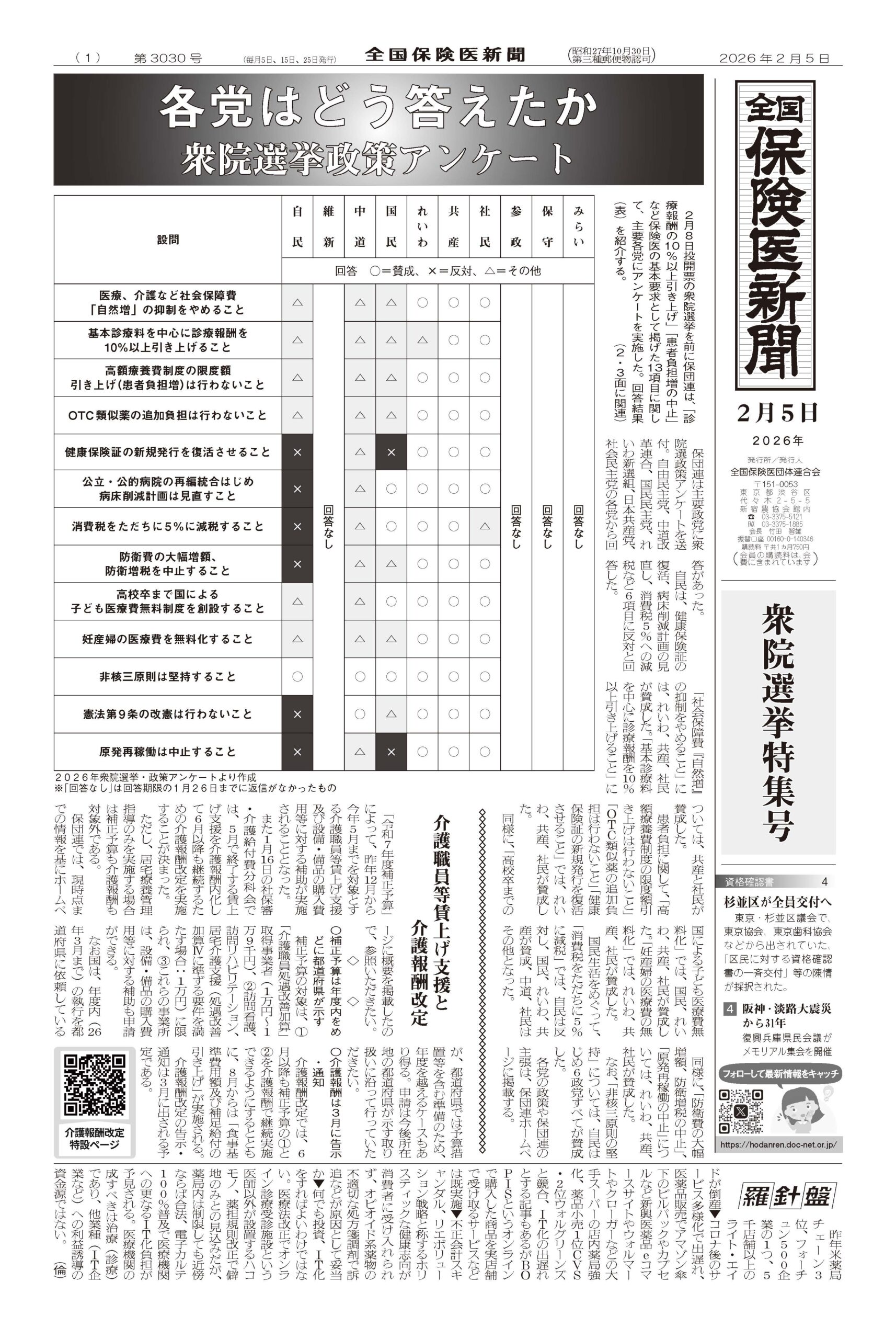 つぶやき 2月8日投開票の衆議院選挙を前に、全国保険医団体連合会は保険医の基本要求として掲げた13項目に関して、主要各党にアンケートを実施しました。回答結果を紹介します。 ※「回答なし」は回答期限の1月26日までに返信がなかったもの PDF2026衆院選特設ページ 個人情報保護方針 / 個人情報保護法に基づく公表事項に関するご案内 / 個人情報に関する基本方針 / 共済制度にご加入の皆様へ / 休保制度勧誘方針