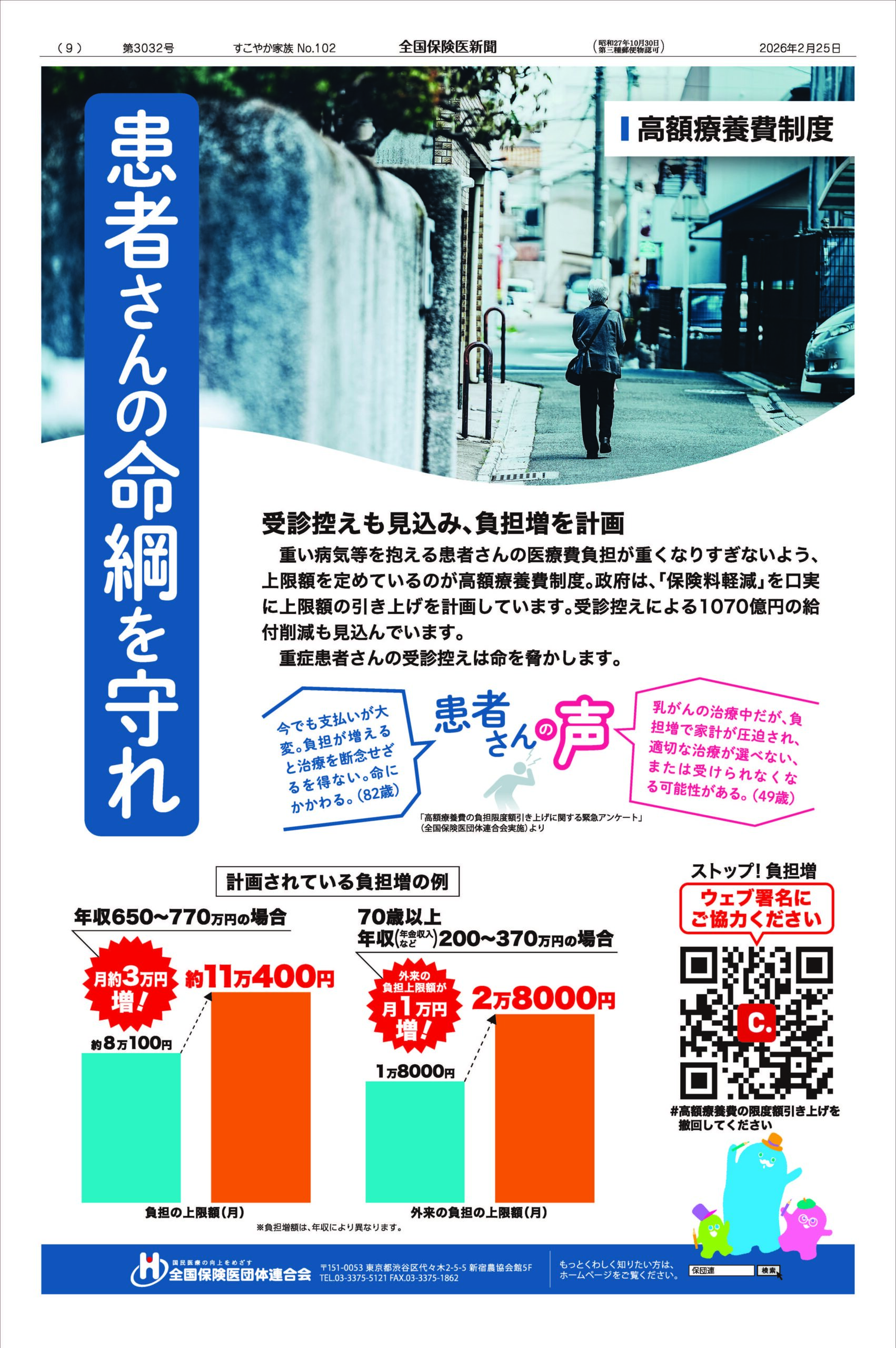 ポスターのダウンロードはこちらから#高額療養費の限度額引き上げを撤回してください ウェブ署名はこちらからつぶやき 総選挙が終わり、高額療養費制度の負担上限額の引き上げの議論が本格化します。 重い病気を抱える患者さんの負担増は、命を脅かします。 保団連は、患者さんに問題を知らせ、署名を呼び掛けるポスターを作成しました。 医療機関などでご活用ください。 (全国保険医新聞2月25日号に折り込んでいます。) ※ポスターデータの利用は、個人の使用の範囲にとどめてください。 個人情報保護方針 / 個人情報保護法に基づく公表事項に関するご案内 / 個人情報に関する基本方針 / 共済制度にご加入の皆様へ / 休保制度勧誘方針