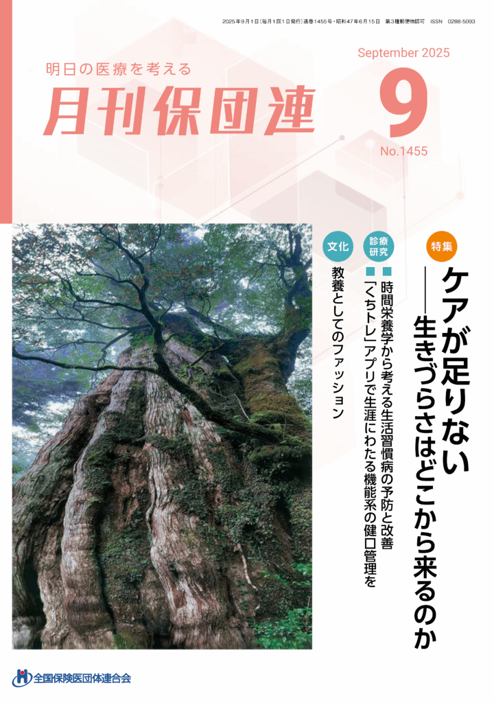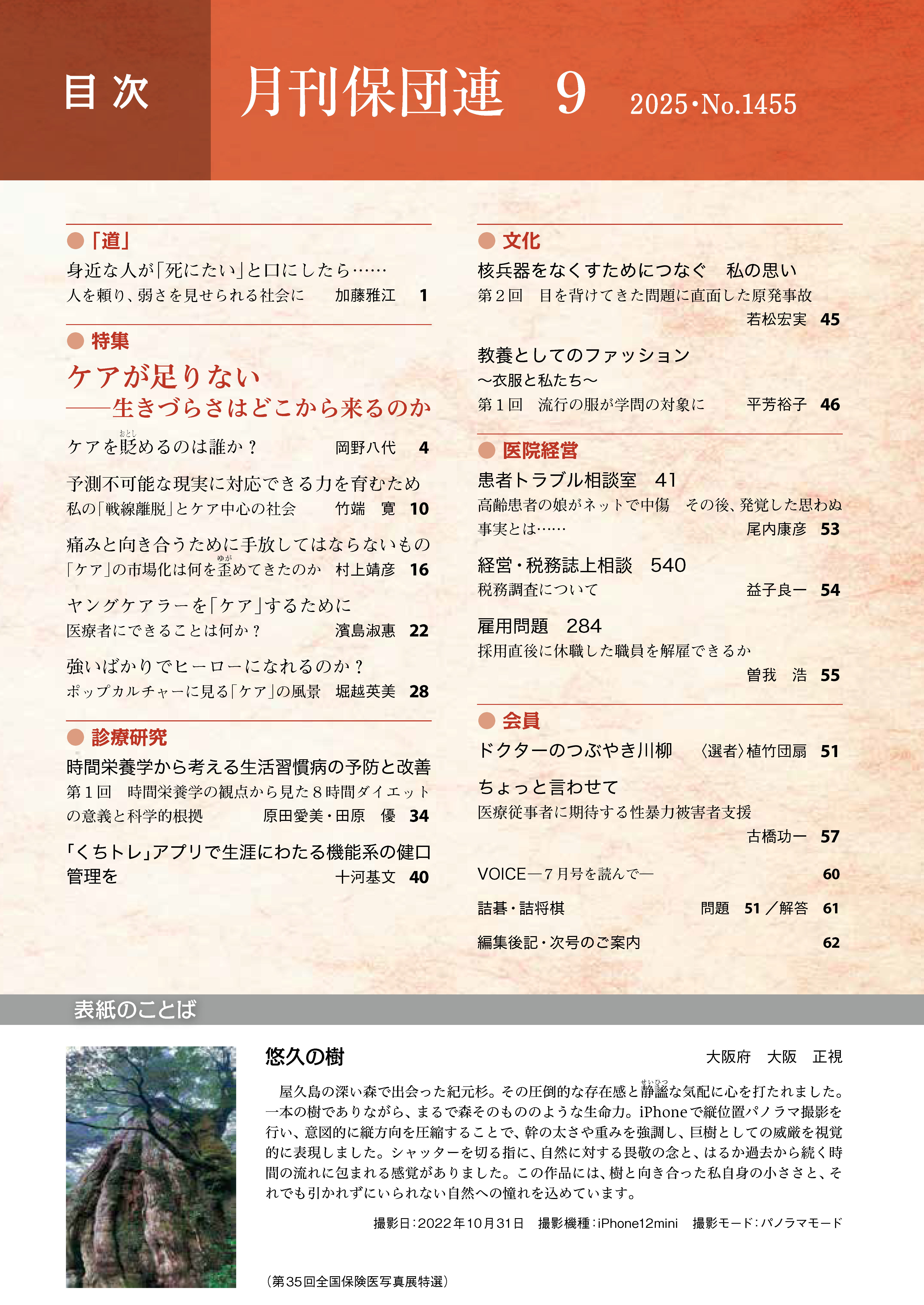 バックナンバーご意見・ご感想記事検索 記事を読む(PDF) 「道」 身近な人が「死にたい」と口にしたら…… 人を頼り、弱さを見せられる社会に 加藤 雅江 特集「ケアが足りない――生きづらさはどこから来るのか」 ケアを貶おとしめるのは誰か? 岡野八代 予測不可能な現実に対応できる力を育むため 私の「戦線離脱」とケア中心の社会 竹端 寛 痛みと向き合うために手放してはならないもの 「ケア」の市場化は何を歪ゆがめてきたのか 村上靖彦 ヤングケアラーを「ケア」するために 医療者にできることは何か? 濱島淑惠 強いばかりでヒーローになれるのか? ポップカルチャーに見る「ケア」の風景 堀越英美 診療研究 時間栄養学から考える生活習慣病の予防と改善 第1回 時間栄養学の観点から見た8時間ダイエットの意義と科学的根拠 原田愛美・田原 優 診療研究 「くちトレ」アプリで生涯にわたる機能系の健口管理を 十河基文 文化 教養としてのファッション~ 衣服と私たち~ 第1回 流行の服が学問の対象に 平芳裕子 核兵器をなくすためにつなぐ 私の思い 第2回 目を背けてきた問題に直面した原発事故 若松宏実 経営 【経営・税務誌上相談】税務調査について 益子良一 【雇用問題】採用直後に休職した職員を解雇できるか 曽我 浩 【患者トラブル相談室】高齢患者の娘がネットで中傷 その後、発覚した思わぬ事実とは…… 個人情報保護方針 / 個人情報保護法に基づく公表事項に関するご案内 / 個人情報に関する基本方針 / 共済制度にご加入の皆様へ / 休保制度勧誘方針