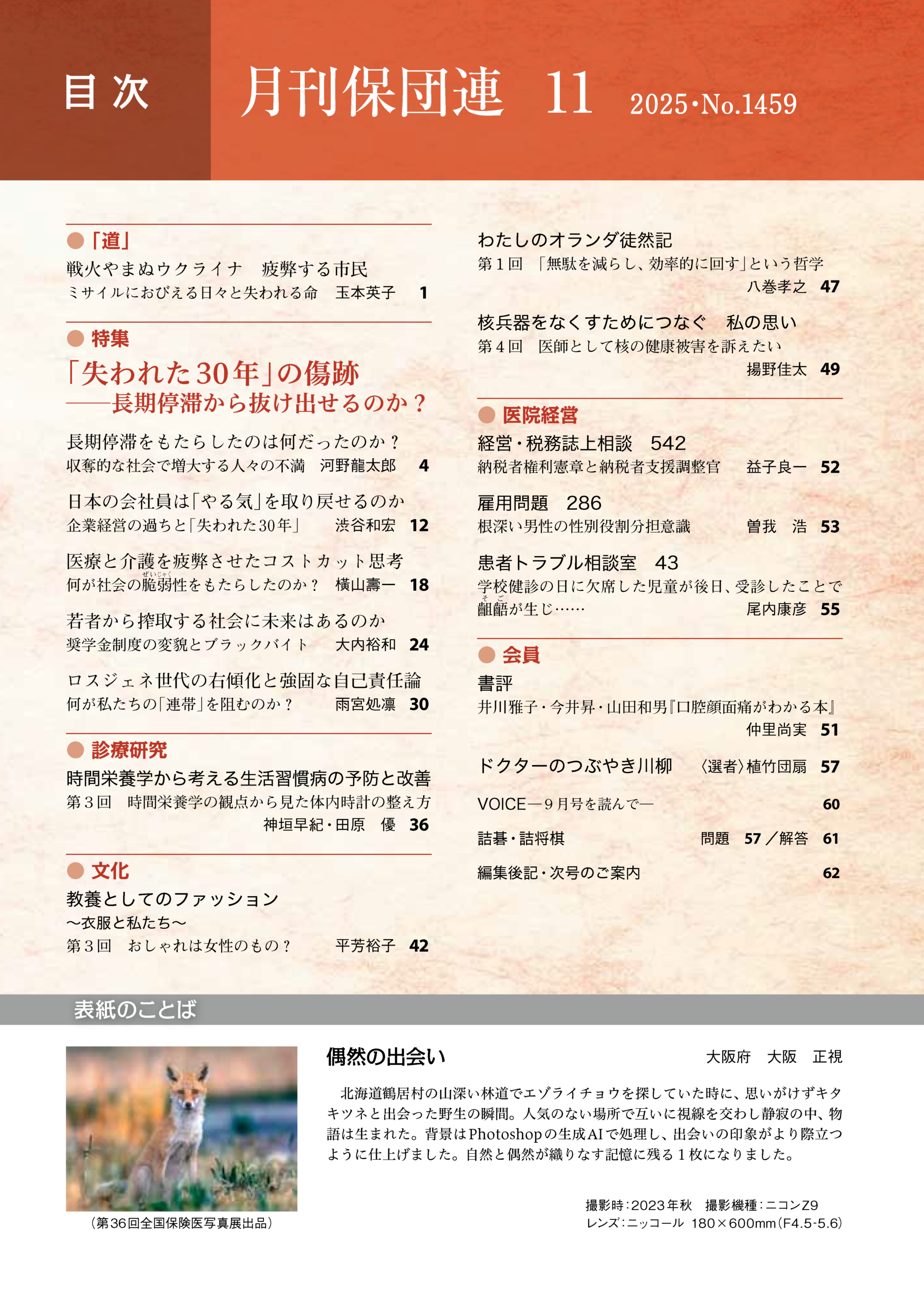 バックナンバーご意見・ご感想記事検索 記事を読む(PDF) 「道」 戦火やまぬウクライナ 疲弊する市民 ミサイルにおびえる日々と失われる命 玉本英子 特集「「失われた30年」の傷跡 ──長期停滞から抜け出せるのか?」 長期停滞をもたらしたのは何だったのか? 収奪的な社会で増大する人々の不満 河野龍太郎 日本の会社員は「やる気」を取り戻せるのか 企業経営の過ちと「失われた30年」 渋谷和宏 医療と介護を疲弊させたコストカット思考 何が社会の脆ぜい弱じゃく性をもたらしたのか? 橫山壽一 若者から搾取する社会に未来はあるのか 奨学金制度の変貌とブラックバイト 大内裕和 ロスジェネ世代の右傾化と強固な自己責任論 何が私たちの「連帯」を阻むのか? 雨宮処凛 診療研究 時間栄養学から考える生活習慣病の予防と改善 第3回 時間栄養学の観点から見た体内時計の整え方 神垣早紀・田原 優 文化 教養としてのファッション ~衣服と私たち~ 第3回 おしゃれは女性のもの? 平芳裕子 わたしのオランダ徒然記 第1回 「無駄を減らし、効率的に回す」という哲学 八巻孝之 核兵器をなくすためにつなぐ 私の思い 第4回 医師として核の健康被害を訴えたい 揚野佳太 経営 【経営・税務誌上相談】納税者権利憲章と納税者支援調整官 益子良一 【雇用問題】根深い男性の性別役割分担意識 曽我 浩 【患者トラブル相談室】学校健診の日に欠席した児童が後日、受診したことで齟齬が生じ…… 尾内康彦 個人情報保護方針 / 個人情報保護法に基づく公表事項に関するご案内 / 個人情報に関する基本方針 / 共済制度にご加入の皆様へ / 休保制度勧誘方針