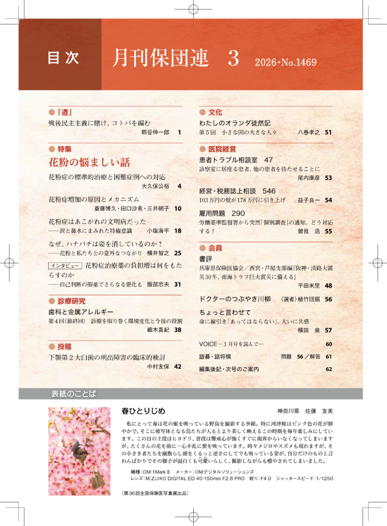 寒い冬が明け梅の香りが漂い始めると、少しずつ春らしくなってくる。お花見も楽しみとなり、どことなく浮き浮きした気分にもなるが、花粉症を持つ身にとっては悩ましい季節でもある。戦後、日本ではスギ花粉を中心に発症者が急速に増えていき、日本耳鼻咽喉科学会が行った全国調査では、2019年の花粉症の有病率は42.5%。多くの人が発症する「国民病」になっている。市販薬も手軽に入手できるようになっているが、その症状は多様であるため、安易な自己判断で悪化する例も見られる。一方で、花粉は本来、植物の生殖に欠かせないものであり、虫媒花で生殖する野菜も多く、私たちの食生活を支えていることも忘れてはならない。ところが、様々な農作物の花粉の送粉を行っているミツバチが大量に姿を消してしまう「蜂群崩壊症候群」が近年になって発生するようになり、その原因究明が大きな課題になっている。